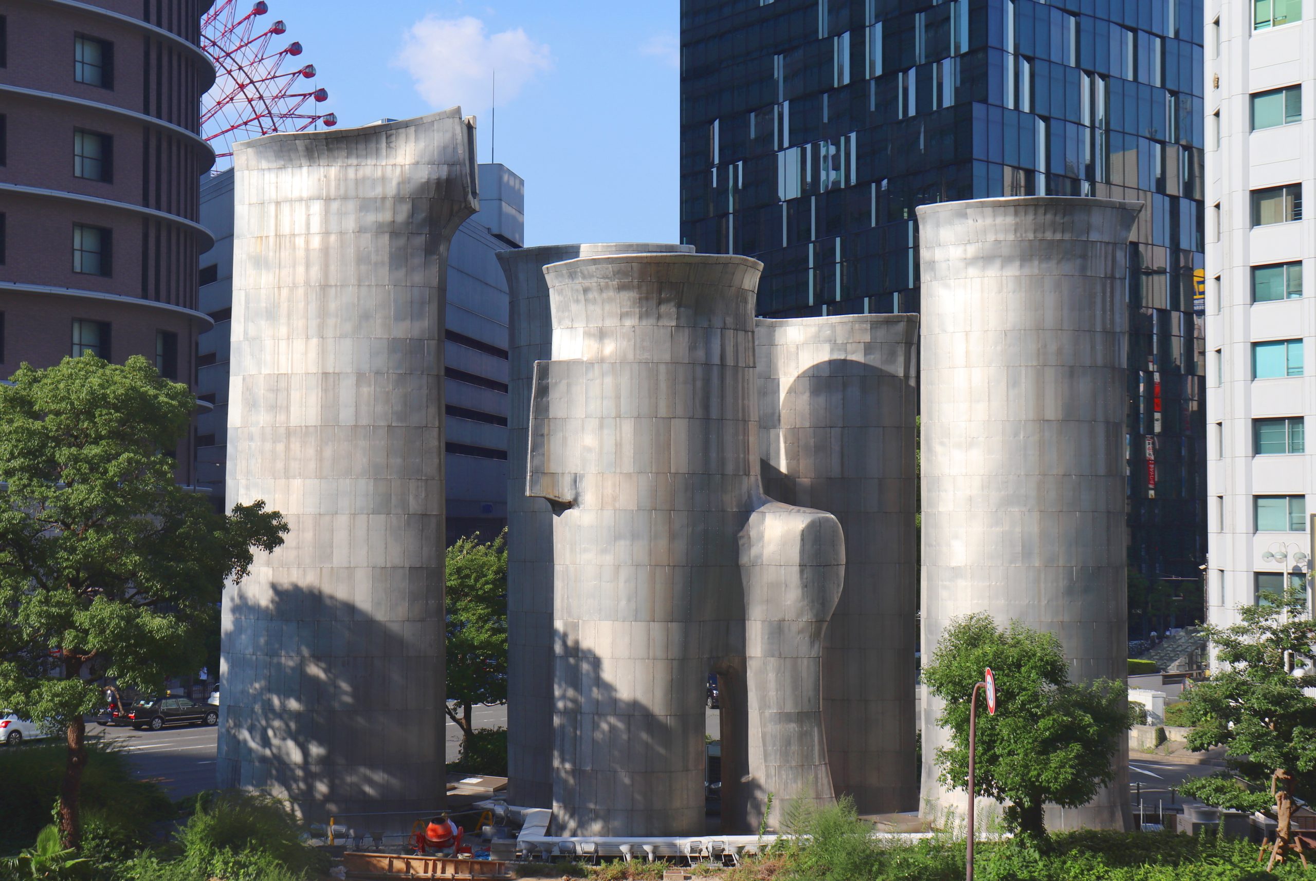 地下街の換気という純粋な機能装置でありながら、楕円形の塔が有機的につながる造形は、都市の風景に不思議な余韻を残す。高層ビルの谷間に立ち、夜には街の光を反射するその姿は、実用と詩性がせめぎ合う村野建築の象徴のひとつだろう。