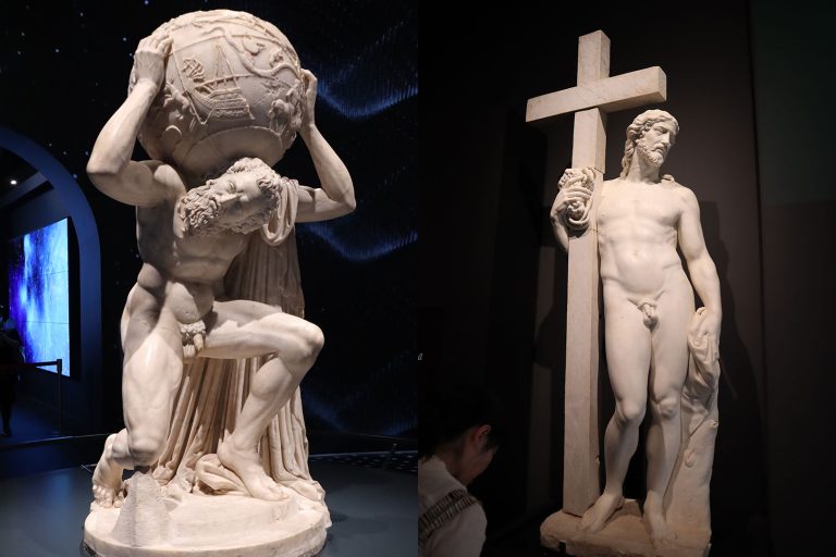 この2つの彫刻の何が凄いかを簡単に言いますと、アトラスはギリシャ神話に出てくる神様でゼウスに負けた罰として「世界の果てで天空を支えろ」と言われた方。この彫刻は西暦150年頃(日本は弥生時代)の作品で、背負っている天空(宇宙)には2世紀に見えていた星座の位置が正確に彫っていて彫刻としてのクオリティもですが天文学的にも凄いんです。